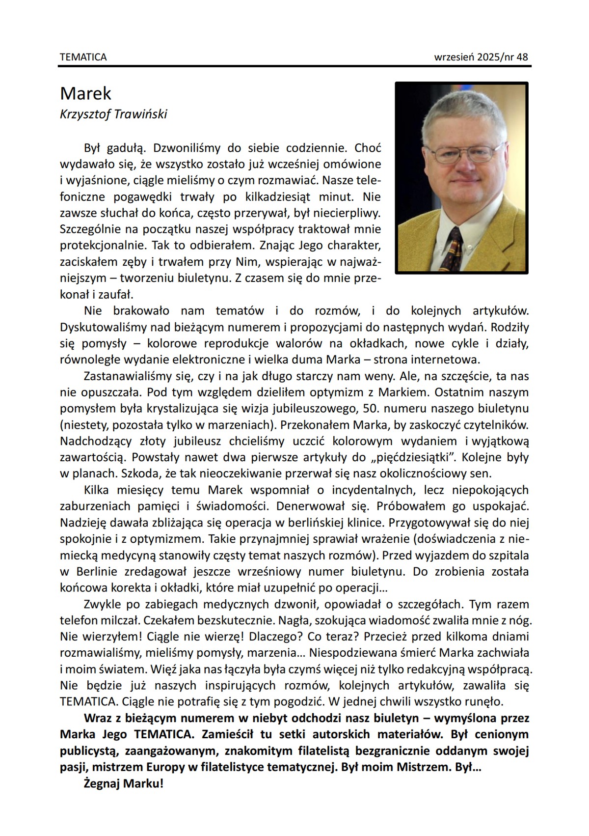 Marek był jednym z jego twórców, siłą napędową i autorem większości tekstów publikowanych w biuletynie, a kim był dla członków klubu, najlepiej świadczą dwa wspomnieniowe artykuły w niniejszym numerze: Krzysztofa Trawińskiego Marek i Witolda Mikołajczyka Żegnaj, Mistrzu.