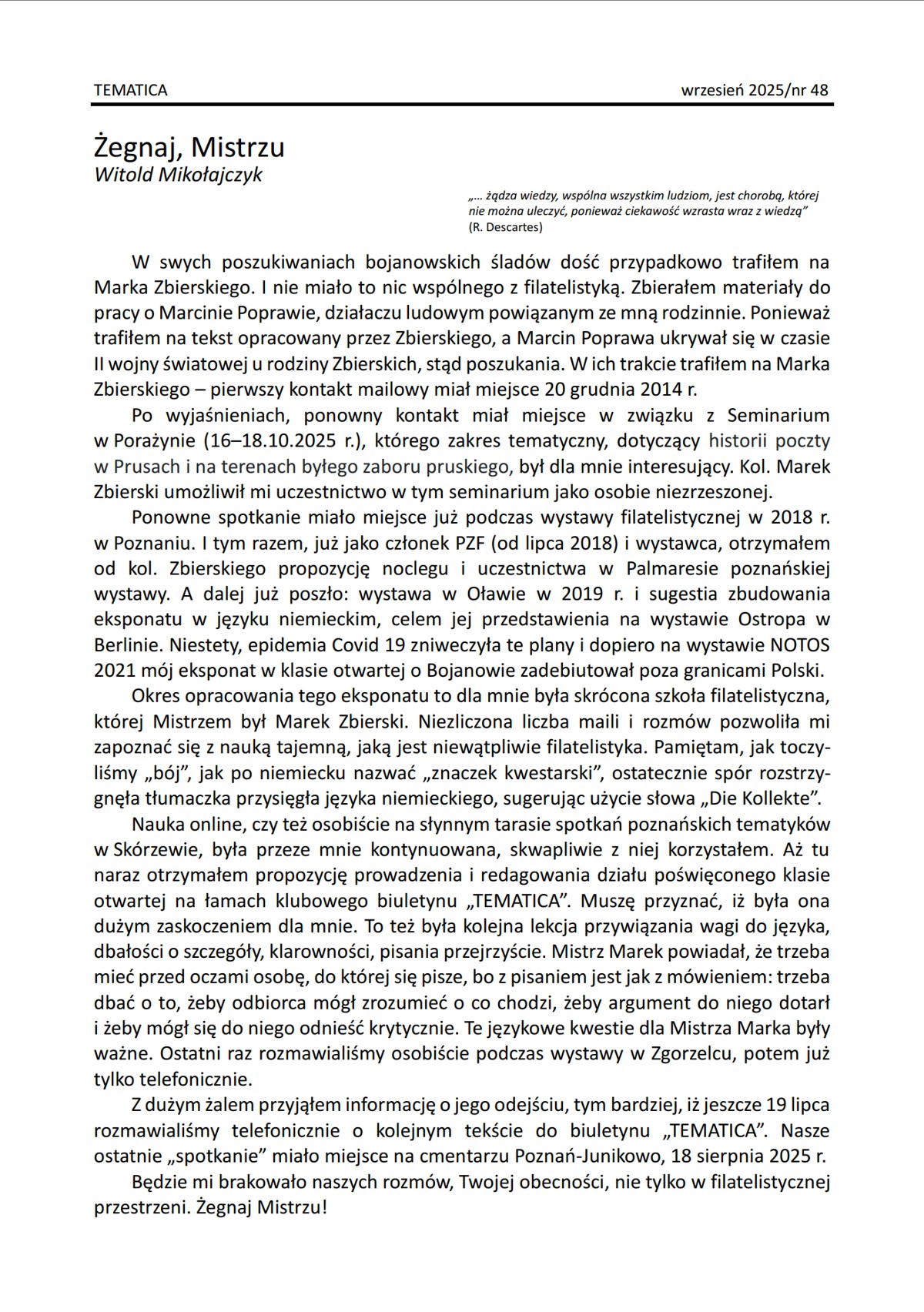 Ukazał się 48., a zarazem ostatni numer biuletynu Klubu TEMATICA, przygotowany jeszcze w 90% przez Marka Zbierskiego. Ostatni, bowiem po jego niespodziewanej śmierci Rada Klubu postanowiła zawiesić działalność klubu.
