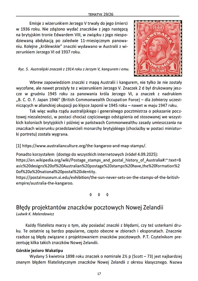 - Ludwik K. Malendowicz, Błędy projektantów znaczków pocztowych Nowej Zelandii, s. 17–21.