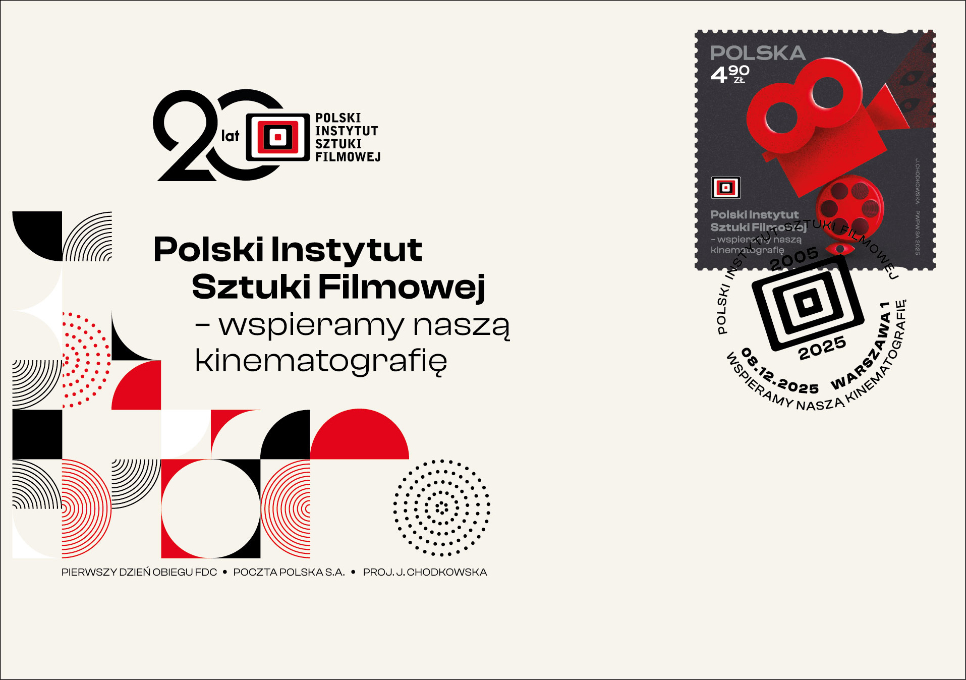W polu znaczka - grafika zaprojektowana z okazji 20-lecia Polskiego Instytutu Sztuki Filmowej nawiązująca do tradycji polskiego plakatu filmowego, reinterpretując ją w nowoczesnej, cyfrowej formie. Centralny motyw stylizowanej kamery symbolizuje sztukę filmową jako przestrzeń spotkania techniki i emocji, obrazu i wyobraźni. Utrzymana w charakterystycznej czerwieni PISF kompozycja podkreśla energię, pasję i dynamikę polskiego kina. Na przywieszce umieszczono stylizowany sygnet Polskiego Instytutu Sztuki Filmowej wraz z latami funkcjonowania instytutu. Projekt został wykonany techniką digital painting, która łączy precyzję cyfrowych narzędzi z malarską głębią i fakturą, tworząc współczesną interpretację artystycznego języka filmu.