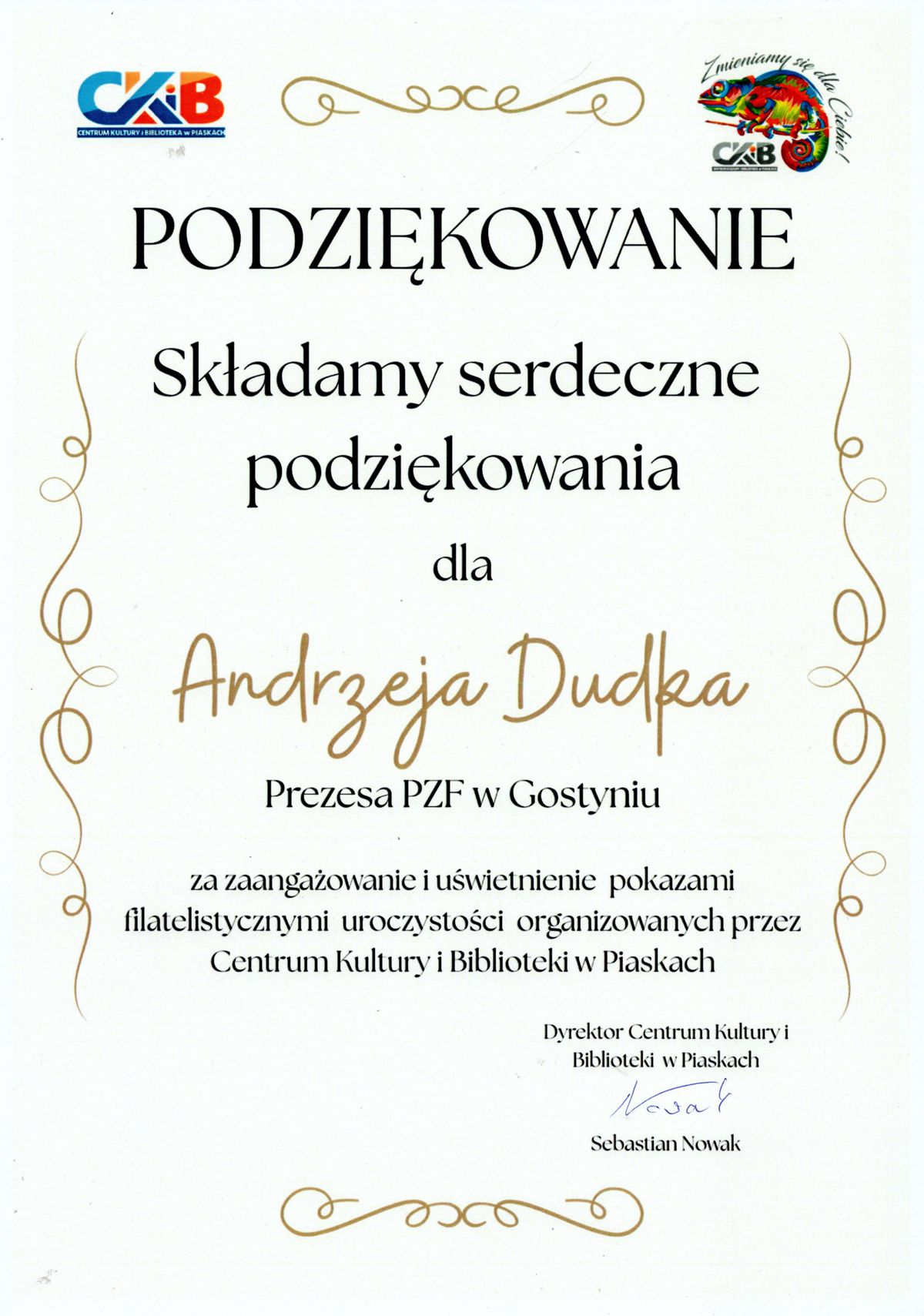 12 grudnia 2025 roku w Centrum Kultury i Biblioteki w Piaskach odbyły się uroczyste obchody 100-lecia powstania miejscowej biblioteki. Imprezą towarzyszącą był pokaz filatelistyczny „Literatura na znaczkach pocztowych” przygotowany przez Andrzeja Dudka i Michała Pohla – członków Koła PZF im. Wacława Boratyńskiego w Gostyniu.