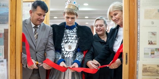 Uroczyste otwarcie wystawy. Od lewej: Tomasz Frischmann – Burmistrz Miasta Oława, uczeń Szkoły Podstawowej nr 1 w Oławie w stroju Bolesława Chrobrego, Dorota Salimandra-Wołowiec – dyrektor Szkoły Podstawowej nr 1 i Bożena Polakowska – Wicestarosta Powiatu Oławskiego.